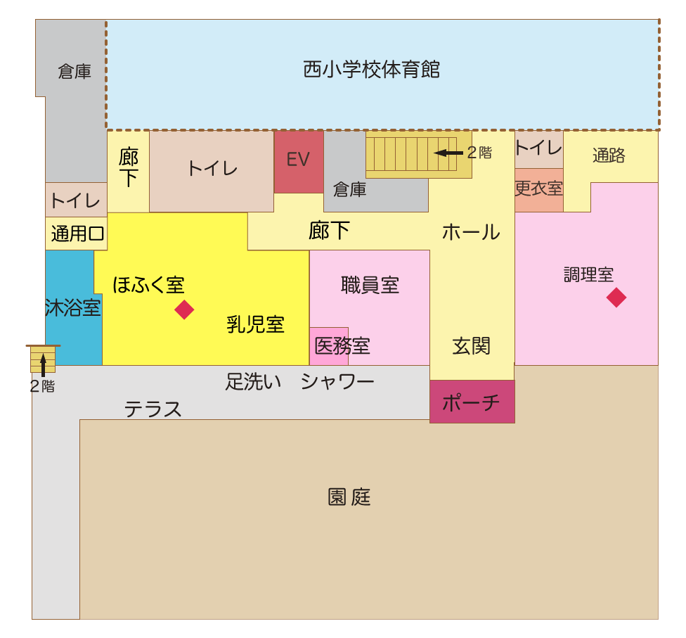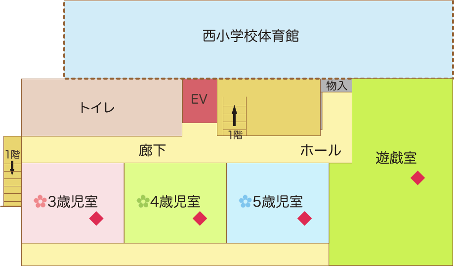 - 安全で楽しく、ゆったりと生活する場として、家庭との連携を持ちながら、保護者が安心して預けることのできる施設とします。