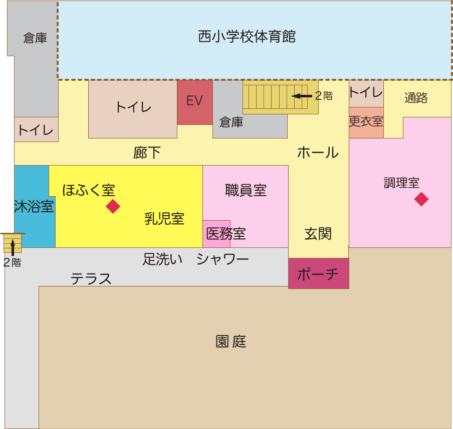 - 安全で楽しく、ゆったりと生活する場として、家庭との連携を持ちながら、保護者が安心して預けることのできる施設とします。